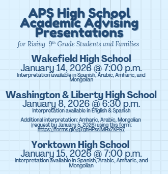 Wakefield High School, 1/14/26 @ 7:00 p.m. Washington & Liberty High School, 1/8/26 @ 6:30 p.m. Yorktown High School, 1/15/26 @ 7:00 p.m.